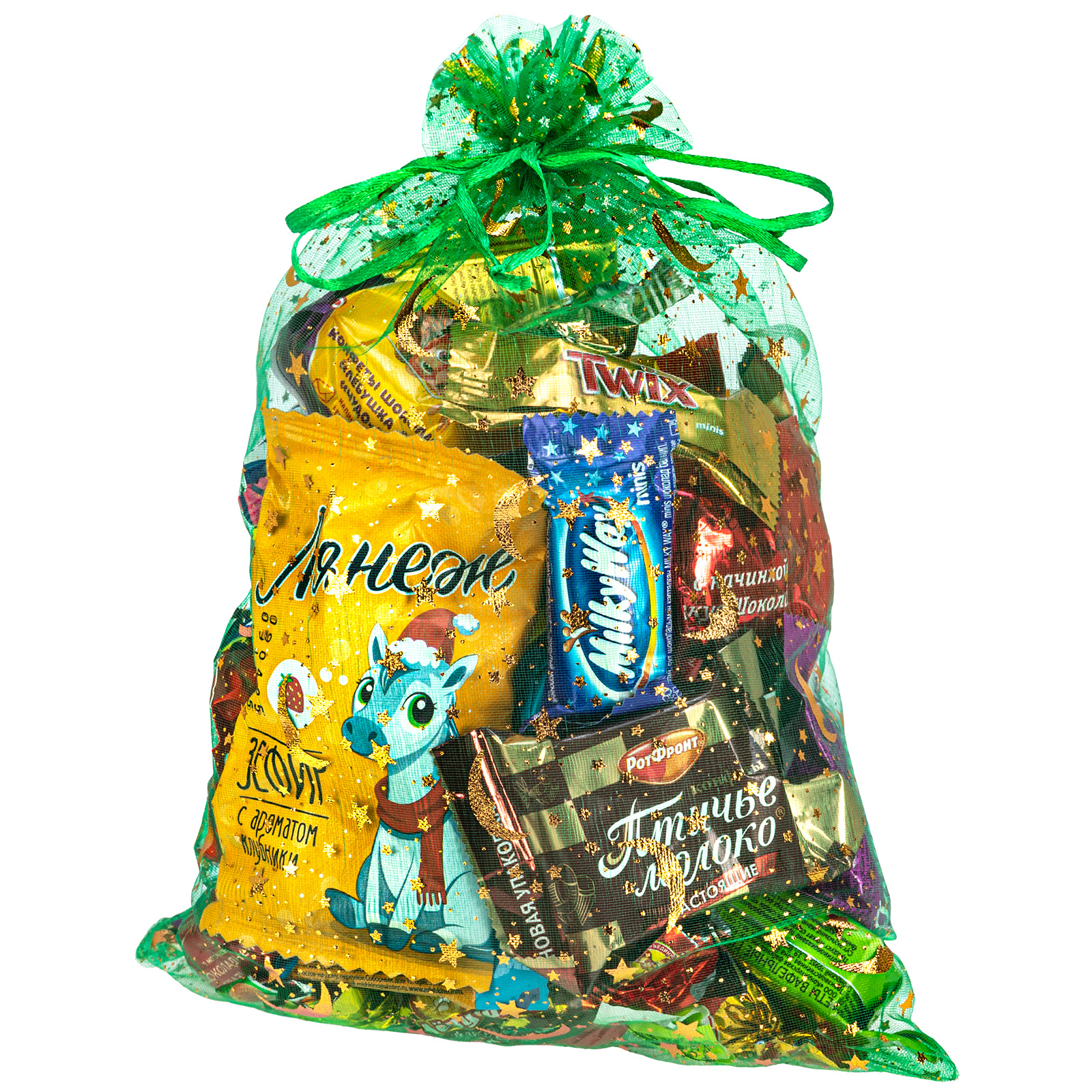 Новогодние сладкие подарки в текстильном мешочке - универсальный выбор, если речь идет о новогоднем празднике в школе или детском саду. “Лунная ночь” - это компактный бюджетный подарочный набор, упакованный в зеленый текстильный мешочек, сверху надежно перевязанный веревочкой. В состав подарка входит входит 500 грамм разнообразных кондитерских изделий на любой вкус: желе, бисквиты, батончки, шоколадные конфеты и многое другое. Также в мешочке можно найти небольшой памятный сувенир в виде символа наступающего года - очаровательной грациозной лошадки.