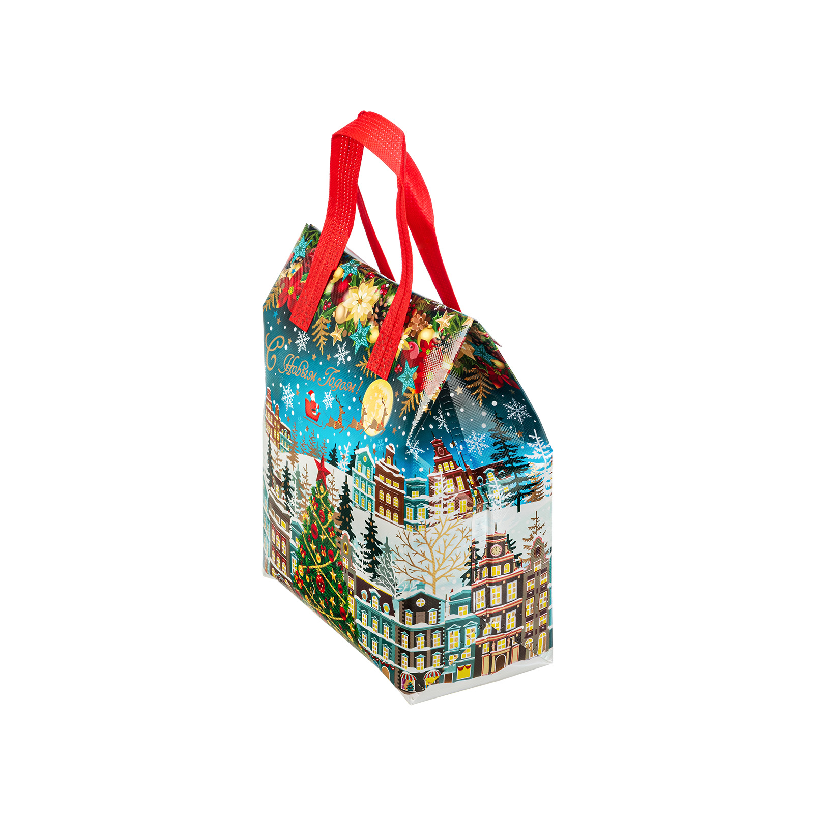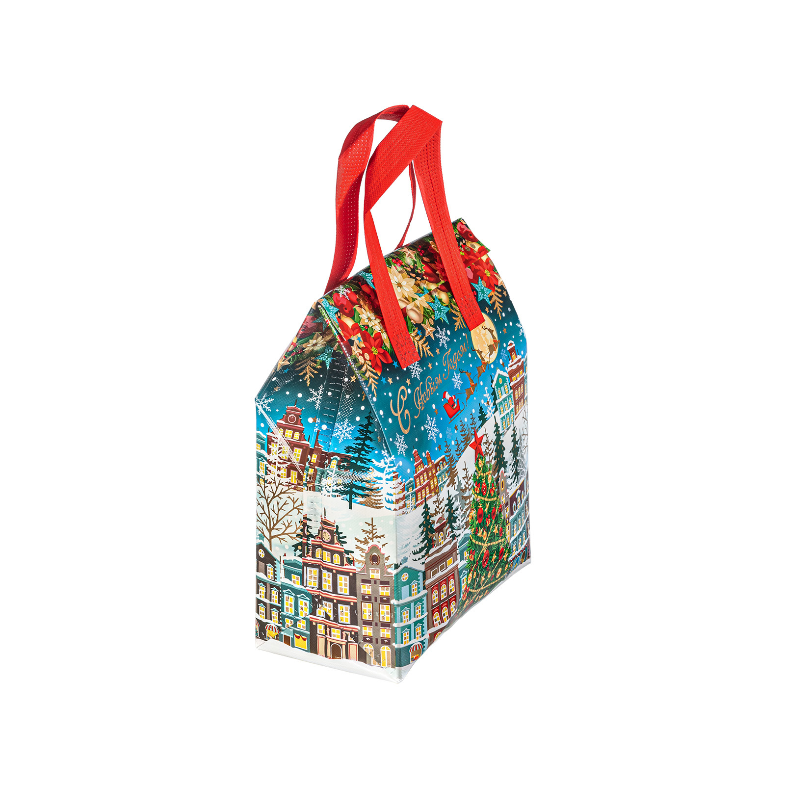 Интересный вариант новогоднего подарка – «Сумочка Чудо-городок». Отлично подойдет на подарок в 2026 году с символом Лошадь. Внутри такого презента находится кондитерский набор весом 1000 граммов.