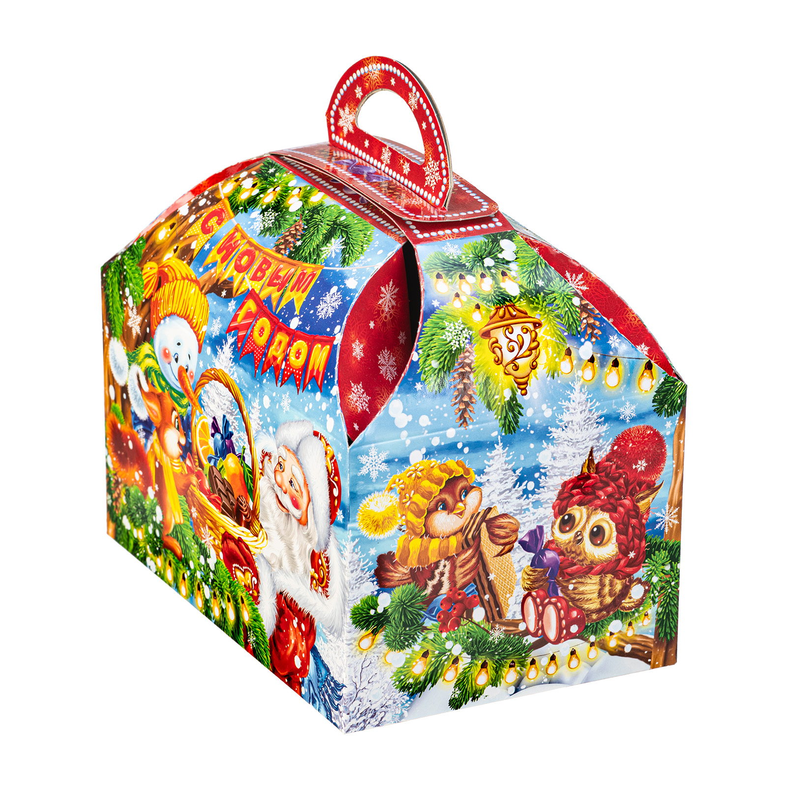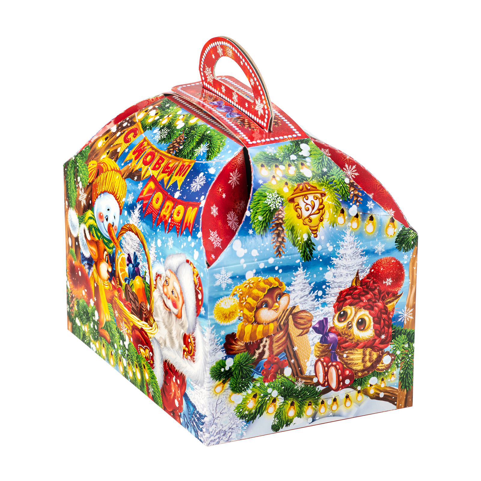 Подарите своим родным и близким безграничную радость вместе с новогодним сладким подарком “Сундук лакомств”. Этот подарочный набор представляет собой небольшую картонную коробочку в форме сундука с удобной ручкой сверху. На упаковке нанесен очень яркий привлекательный рисунок, на котором Дед Мороз и его друзья обмениваются подарками и веселыми улыбками. В состав подарка входит 900 грамм вкусных и разнообразных лакомств от ведущих кондитерских предприятий,  а также небольшой памятный сувенир в виде символа наступающего года.
